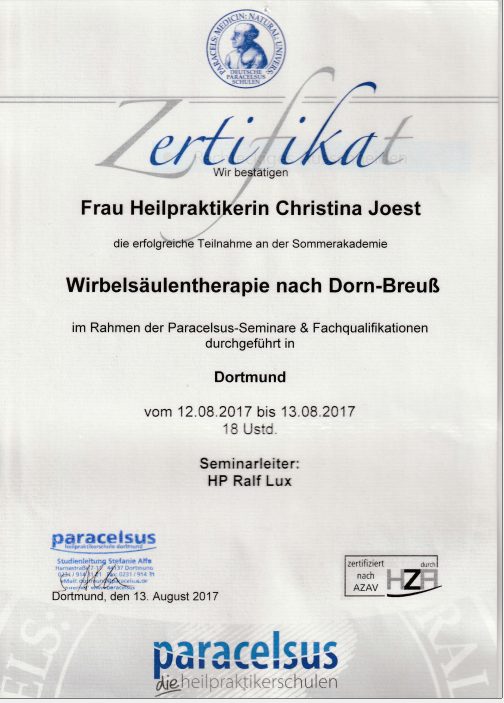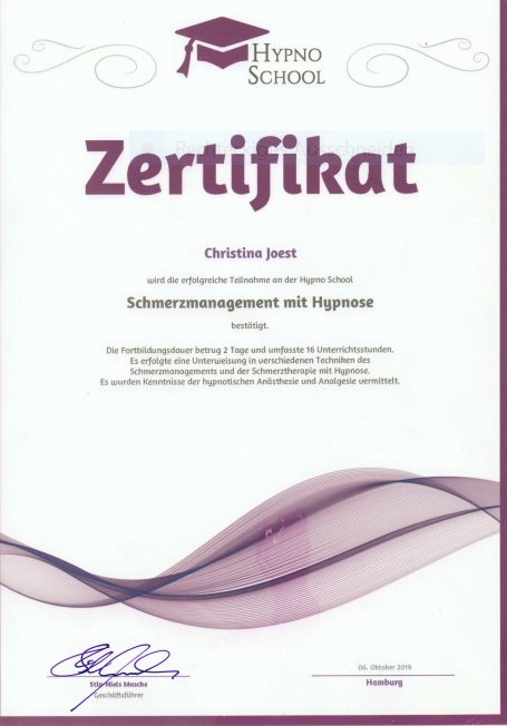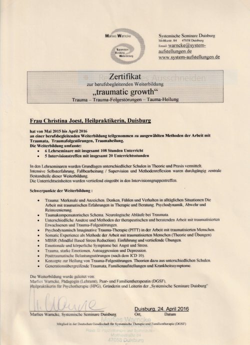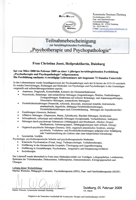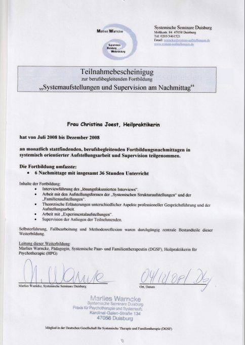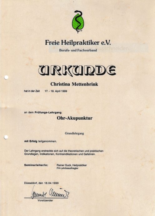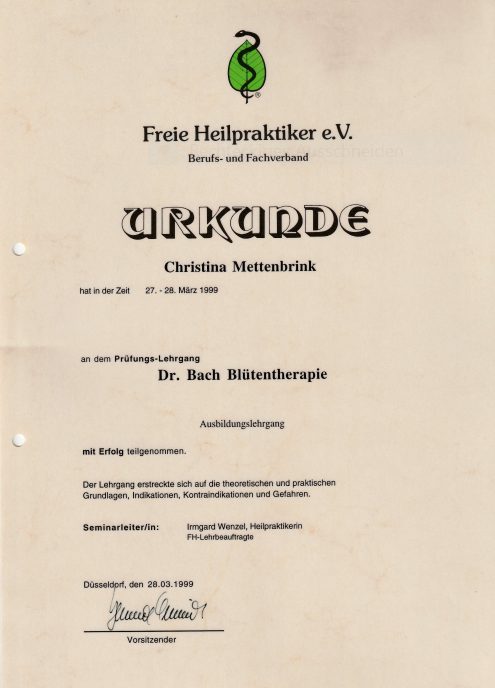 Im Anschluss an die Ausbildung zur Krankenschwester habe ich vier Jahre berufsbegleitend eine Heilpraktikerschule besucht und diese mit der amtsärztlichen Überprüfung zur Heilpraktikerin erfolgreich abgeschlossen.