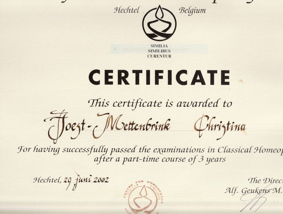 Danach schloss sich ein dreijähriges Studium der klassischen Homöopathie bei Dr. Alfons Geukens in Hechtel, Belgien (http://www.homeopathiehechtel.be) an.